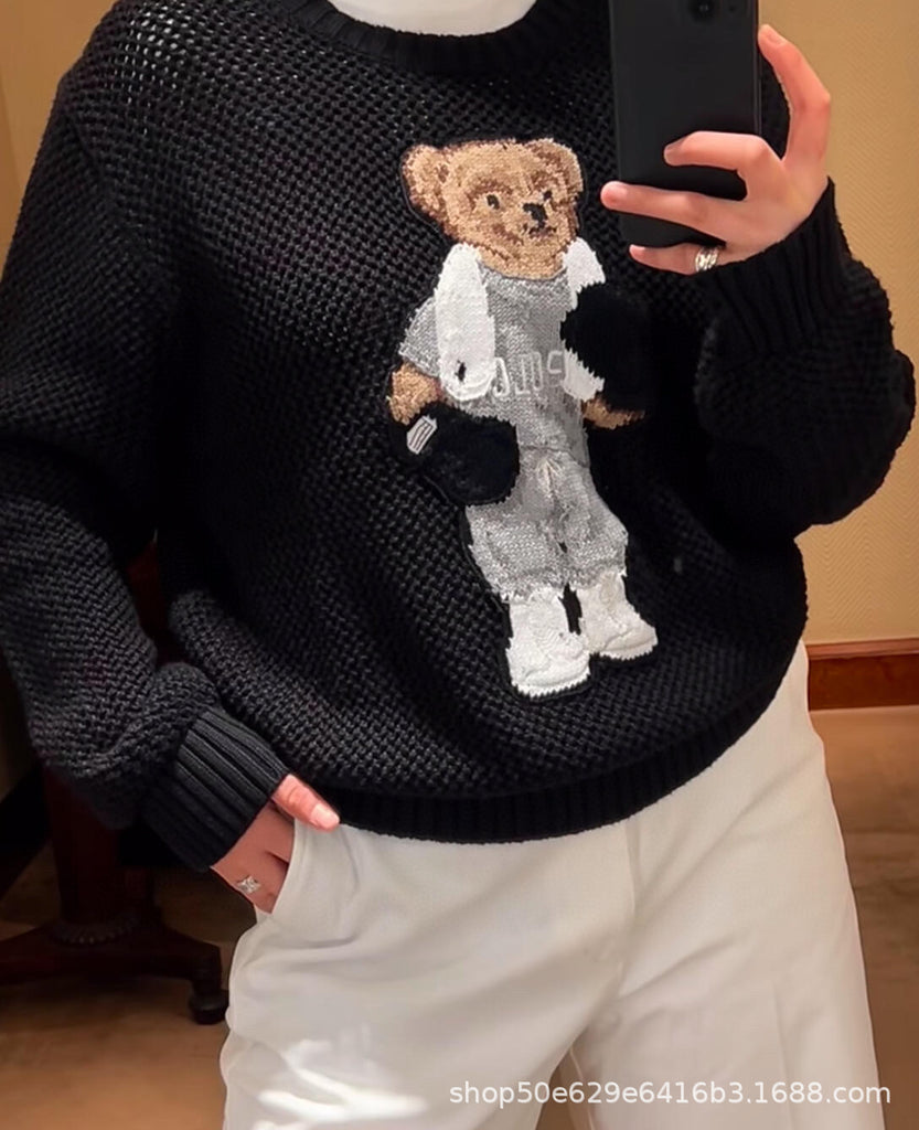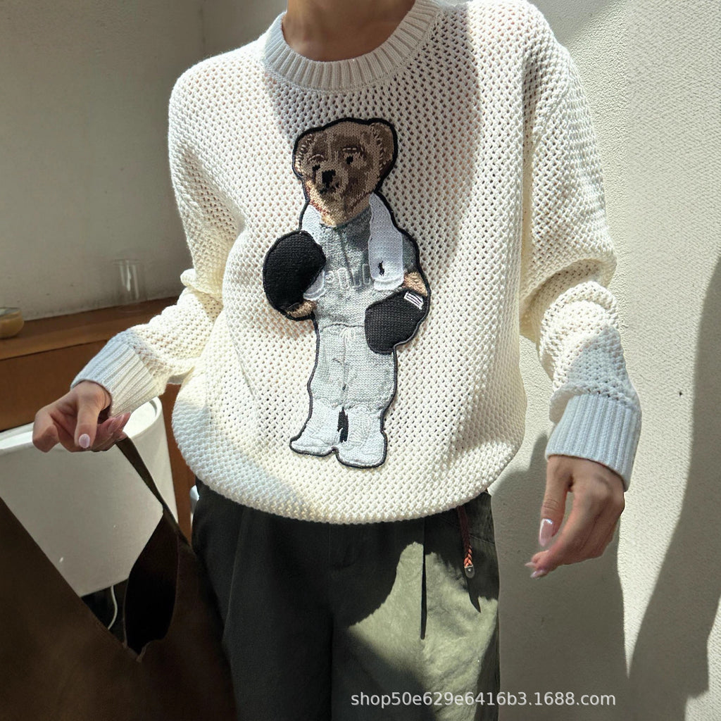 Rl 25 Spring New Women's Hollow out Little War Horse Cartoon Embroidery Jacquard Bear Fashion Age Reducing Versatile Knitted Sweater
