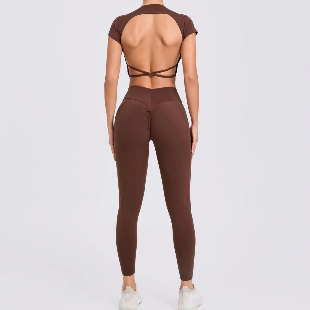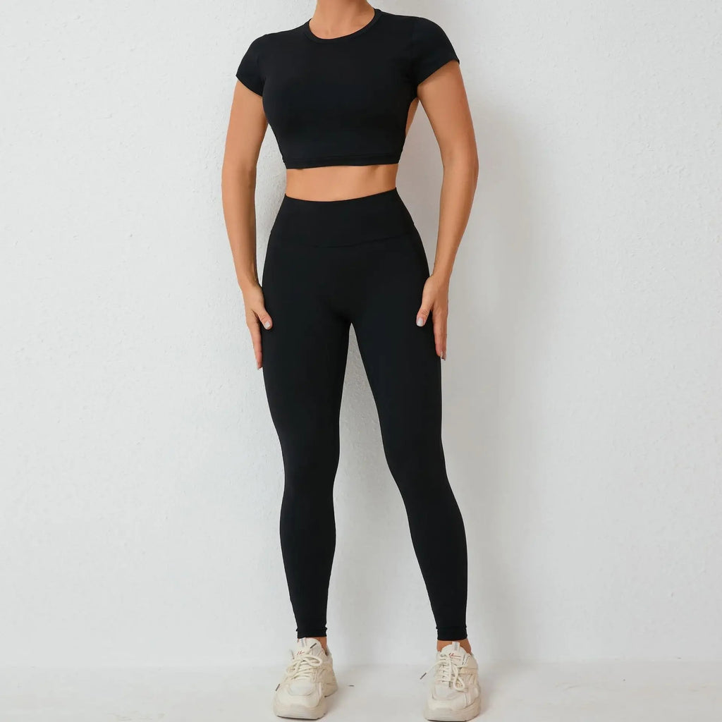 Cross Backless Sporty Set Women 2 Piece Sportswear Short Sleeve Training Suit for Fitness Yoga Wear Female Gym Workout Clothes