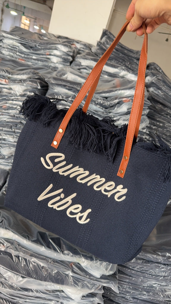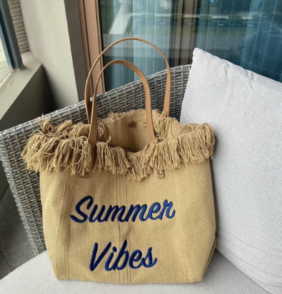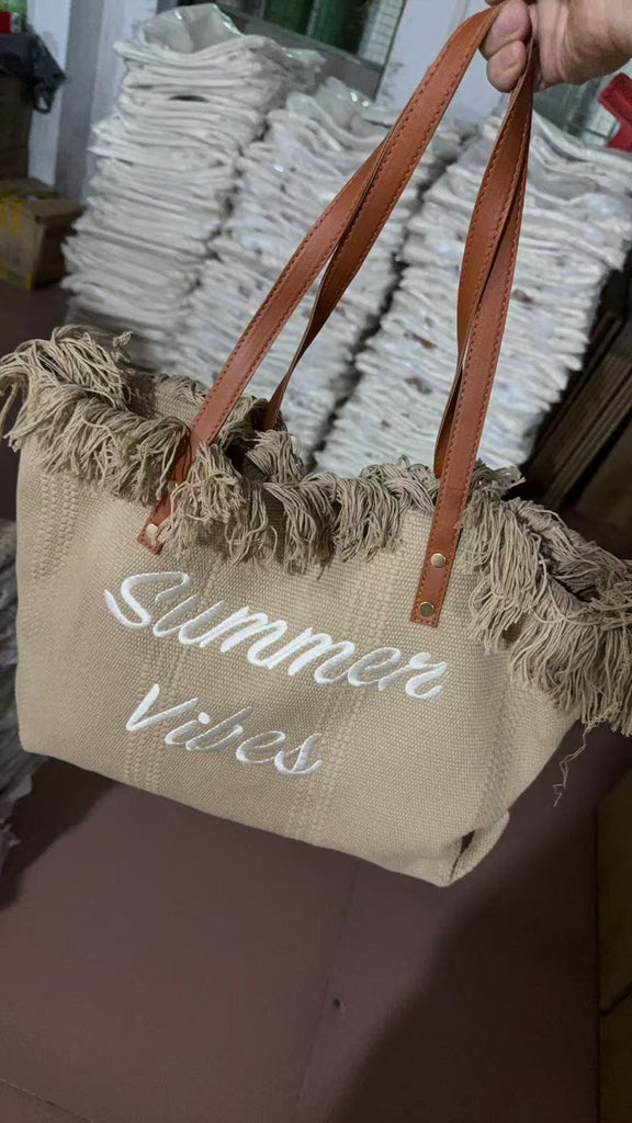 Large capacity canvas tote bag with embroidered letters, handbag for women, woven beach bag, shoulder bag